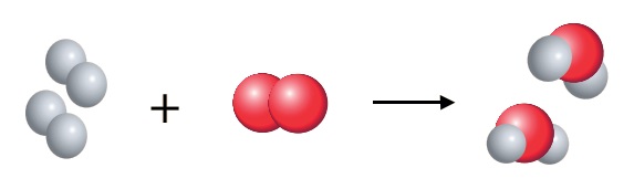 Aşağıda alt mikroskobik model ile gösterilen kimyasal değişimi sembolik model ile yazınız. (Kırmızı atomlar Oksijen, beyaz atomlar ise Hidrojen atomlarıdır.)