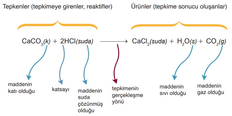 - Kimyasal tepkimede yeri olan bütün maddelerin formülleri ya da sembolleri gösterilir.