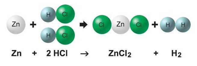Zn(k) + 2HCl(suda) → ZnCl2(suda) + H2(g)