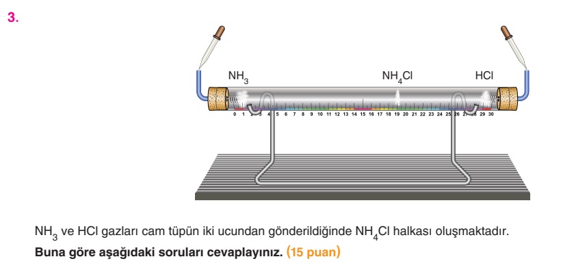 Musluklar aynı anda açılarak gazların ilk karşılaştığı noktalar kaydediliyor. Buna göre aşağıdaki soruları cevaplayınız.