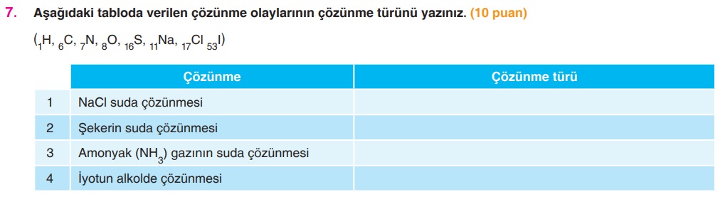 Yanda verilen madde çiftlerinin birbiri içerisinde homojen bir karışım (çözelti) oluşturma durumunu “ÇÖZÜNÜR” veya “ÇÖZÜNMEZ” şeklinde yazarak iki durum için de tanecikler arası kurulacak etkileşim türünü yazınız.